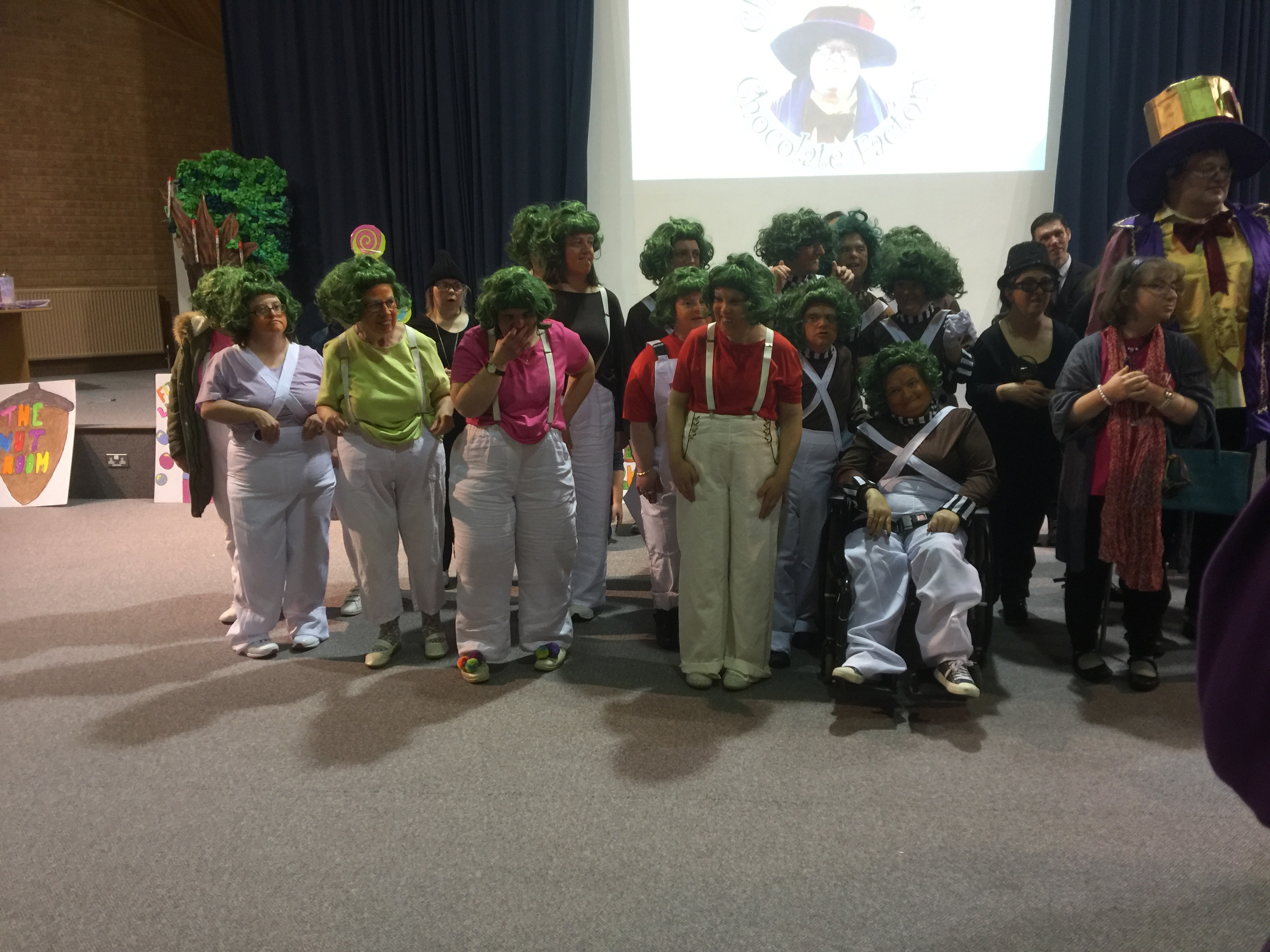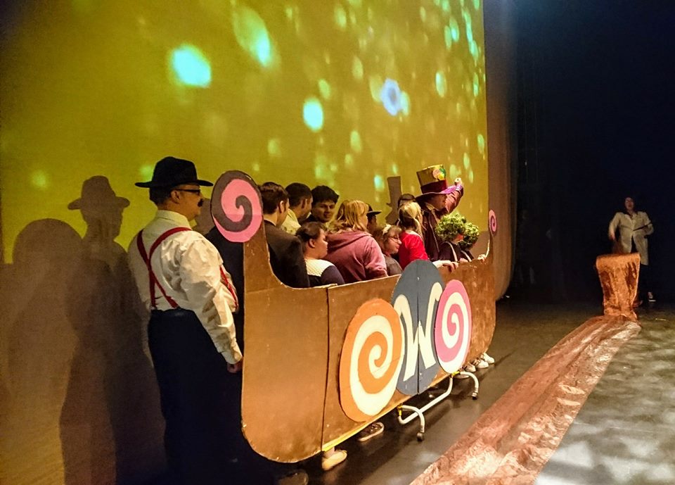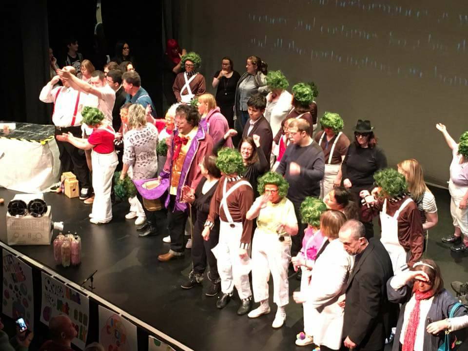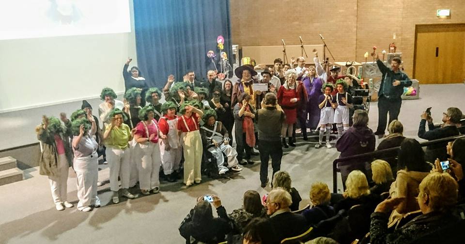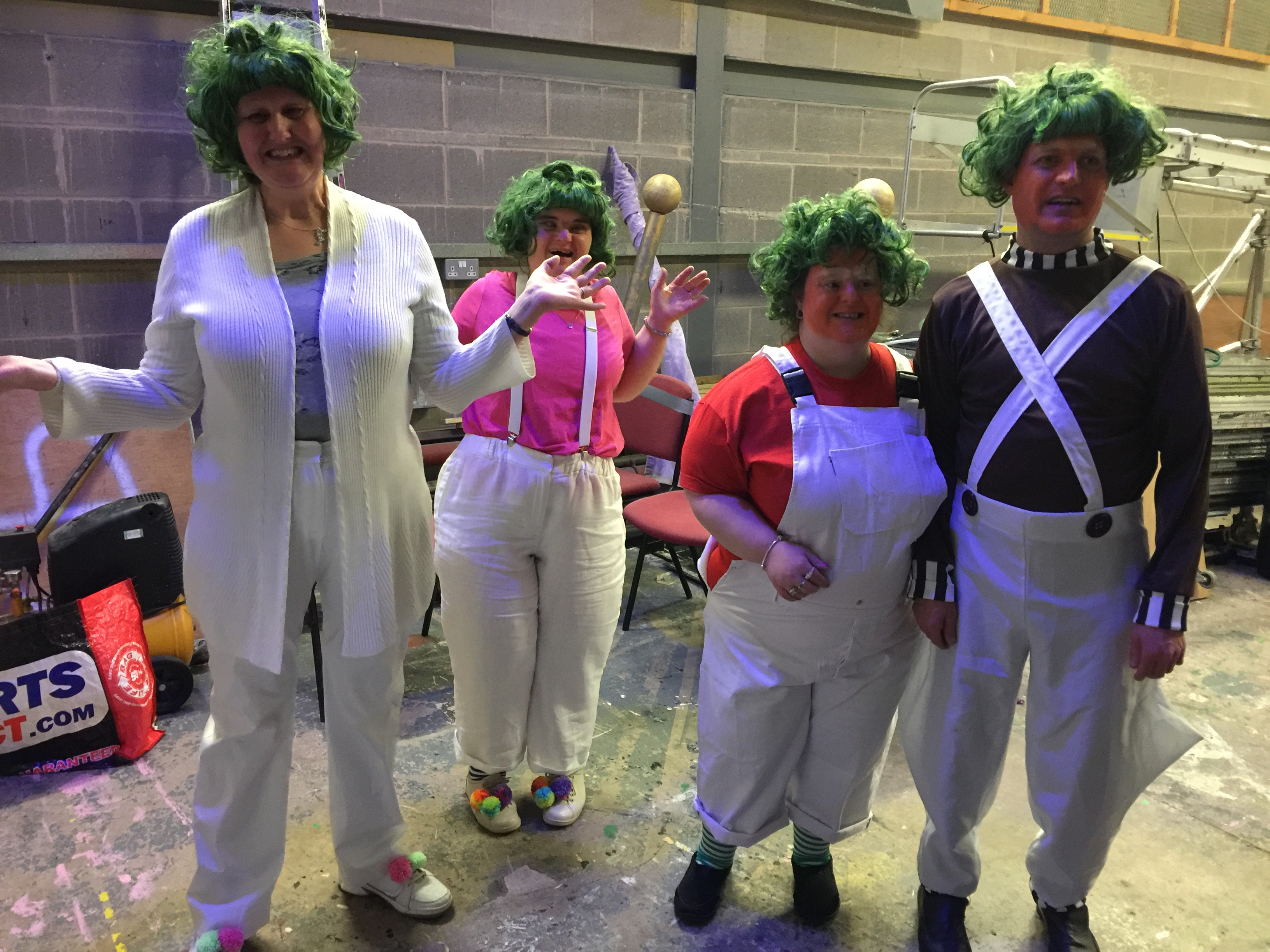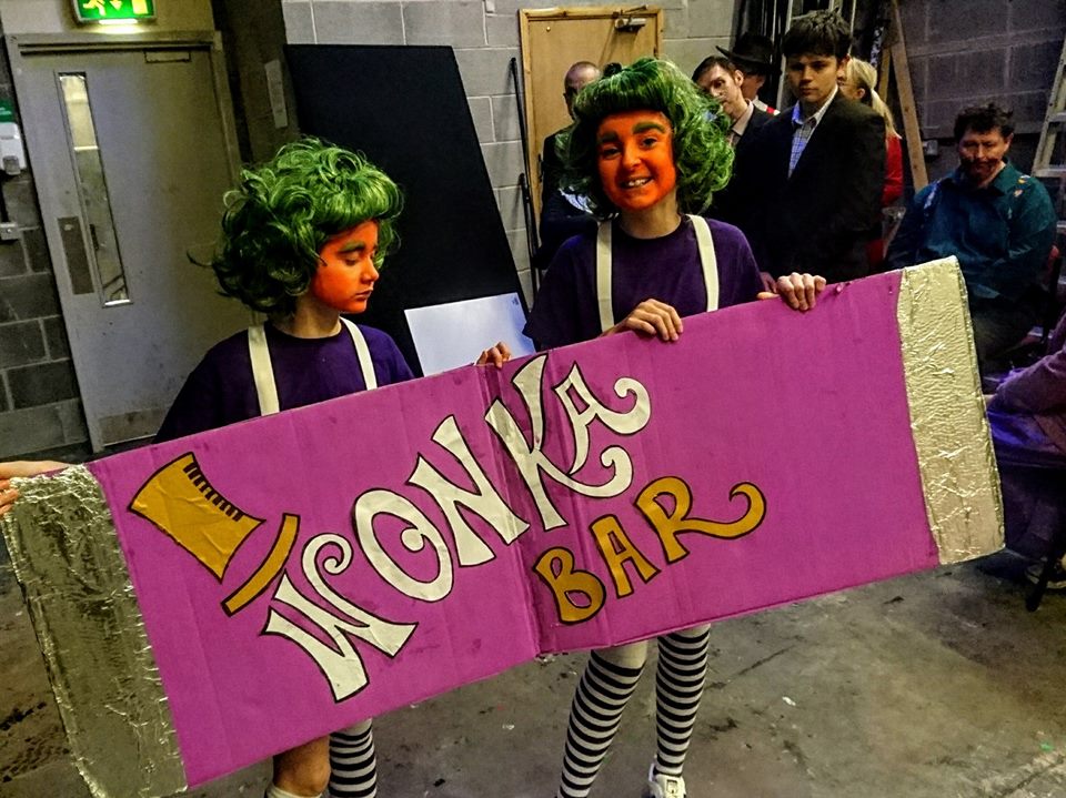 Early in 2016 Take A Bow asked if they could perform Charlie And The Chocolate Factory. There were only a couple of problems! Firstly we didnt have a big enough cast for children, oompa loompas, parents etc – so they invited The Upstagers to join them. Secondly we needed a venue and as we were already rehearsing at the Garrick with some of our members we brought them on board, as well as the Coton Centre, Tamworth for a prelim rehearsal space. Thirdly we had to get permission from the Roald Dahl Estate to create our own adaption of the story and, fourthly additional permission from Warner Brothers because the official show was already showing on the West End
