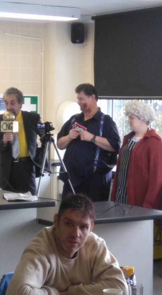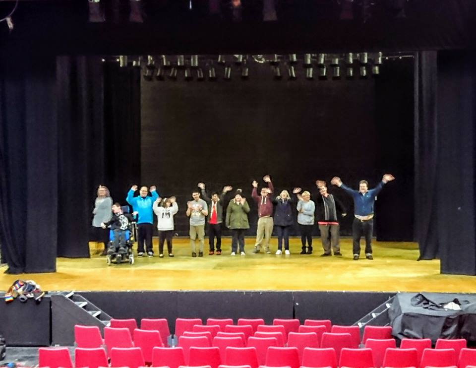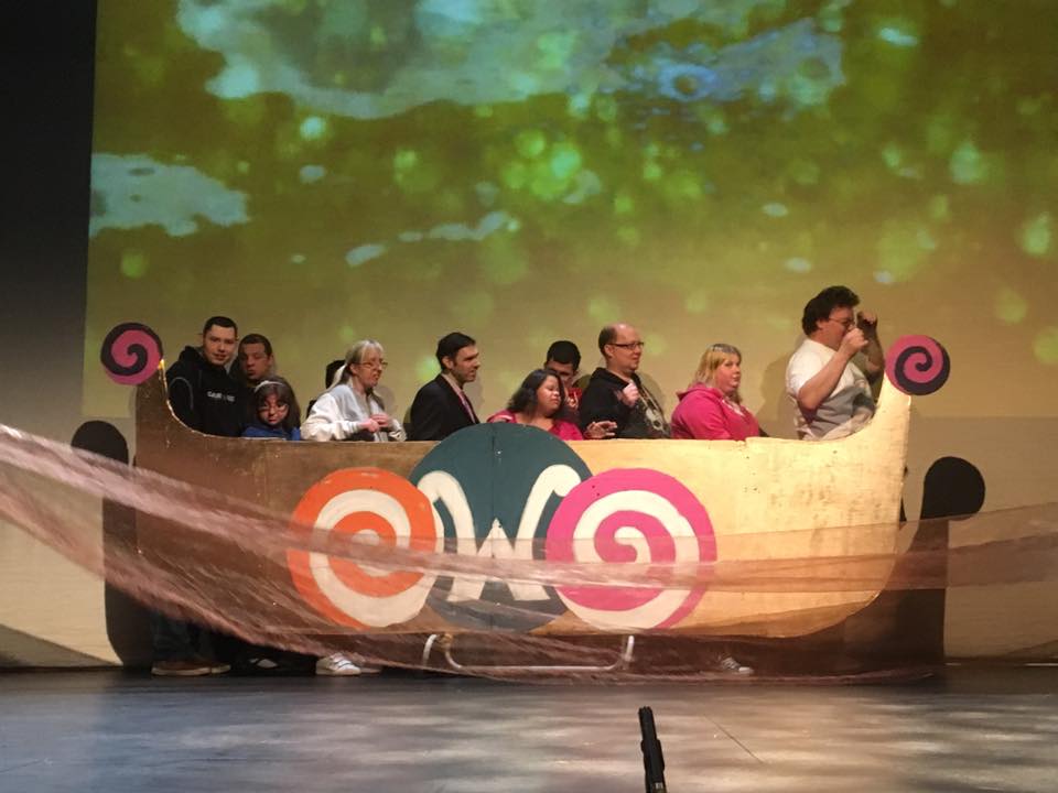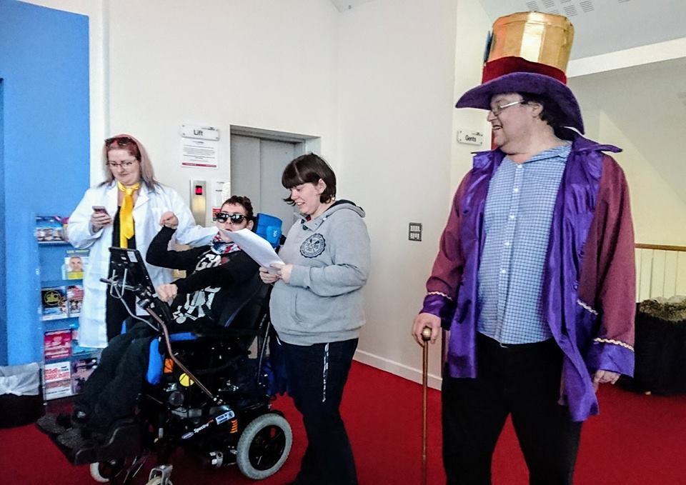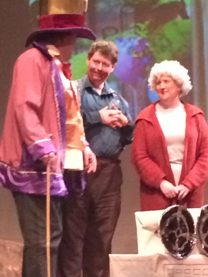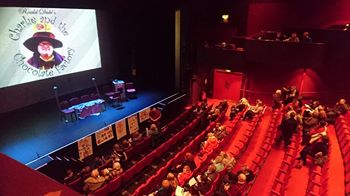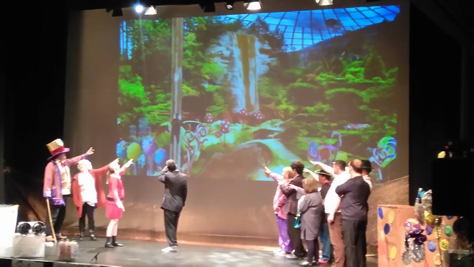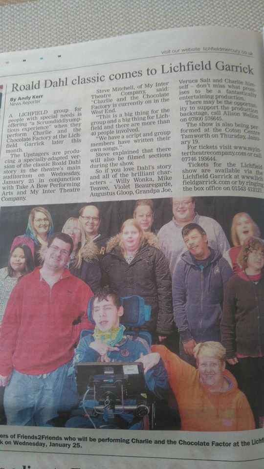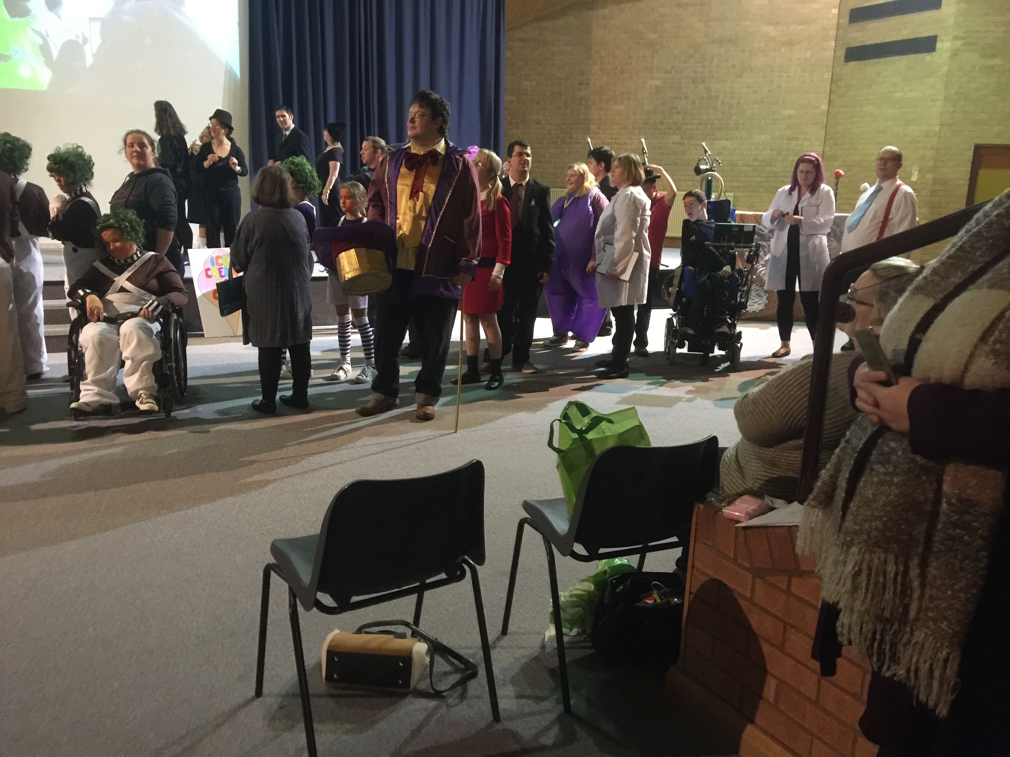 Early in 2016 Take A Bow asked if they could perform Charlie And The Chocolate Factory. There were only a couple of problems! Firstly we didnt have a big enough cast for children, oompa loompas, parents etc – so they invited The Upstagers to join them. Secondly we needed a venue and as we were already rehearsing at the Garrick with some of our members we brought them on board, as well as the Coton Centre, Tamworth for a prelim rehearsal space. Thirdly we had to get permission from the Roald Dahl Estate to create our own adaption of the story and, fourthly additional permission from Warner Brothers because the official show was already showing on the West End